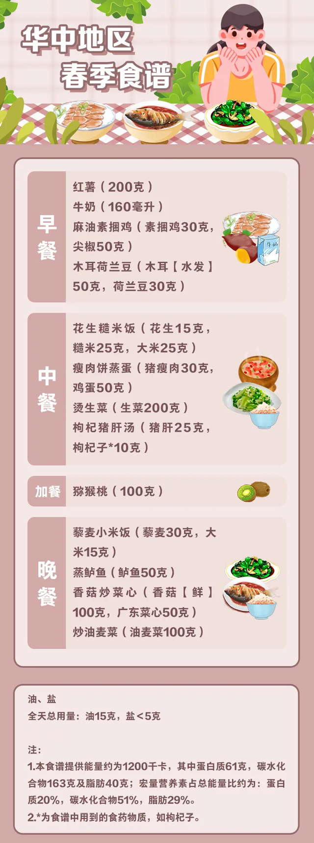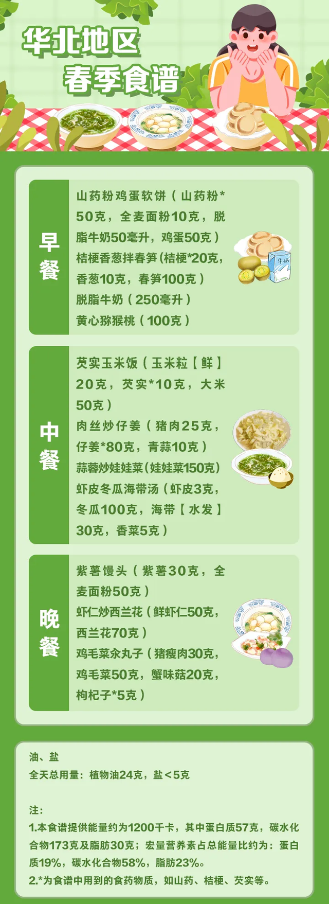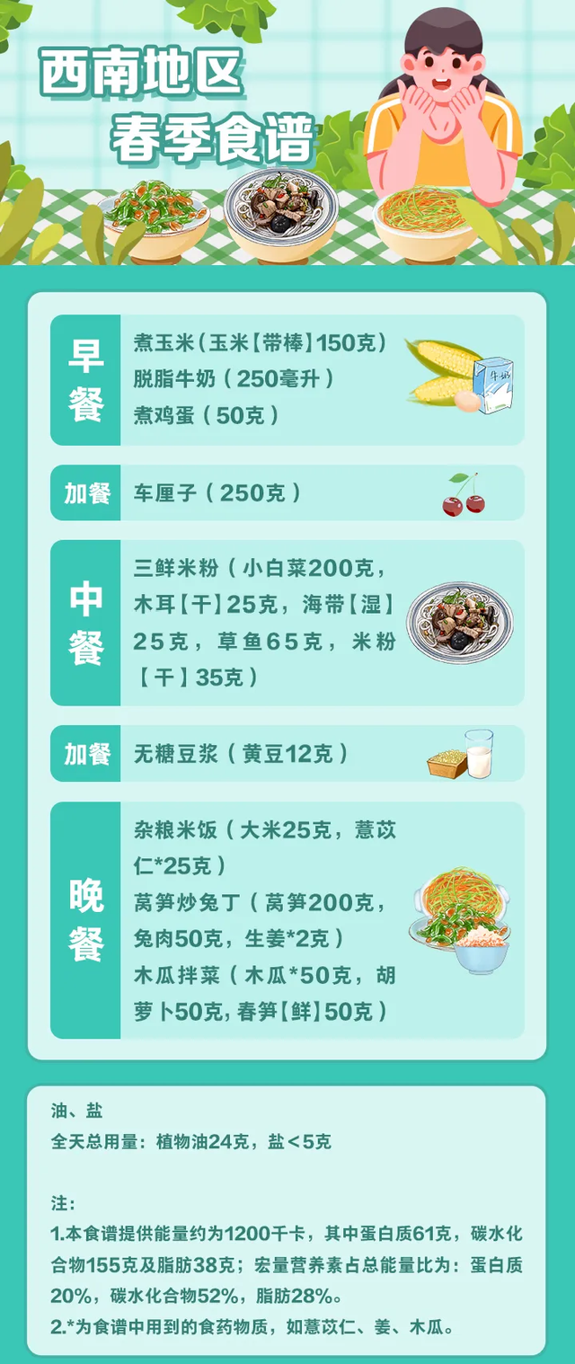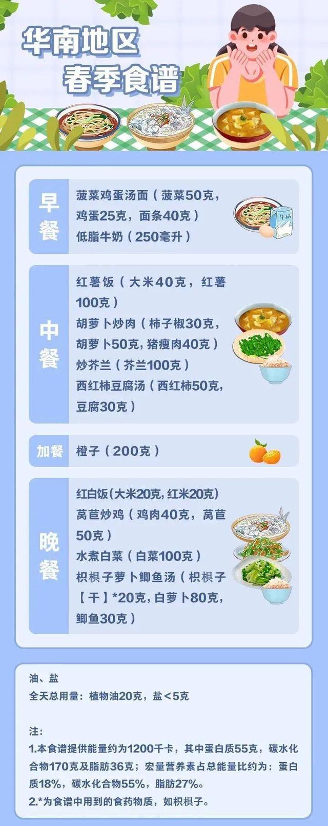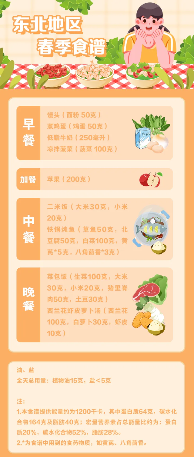 值得注意的是,这份指南还包含了全国不同地区的全天食谱示例,并备注了食谱的“总能量”。不同地区的使用者可参照食养原则和建议,结合食物交换表,根据具体情况进行合理搭配。以春季食谱为例: