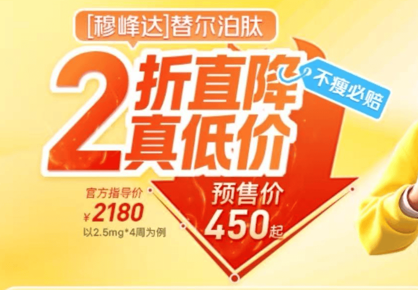 礼来(LLY.N)的替尔泊肽虽未公开降价,但在电商平台也出现了预售促销,醒目标注“2折直降”:2.4ml:10mg/支、2.4ml:20mg/支的替尔泊肽售价分别为450元、750元,其中2.4ml:10mg/支标注“官方指导价2180元”。